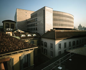 L’intervento ha riguardato la riorganizzazione e il restauro conservativo dello storico teatro milanese e dell’ex-casotto Ricordi, sede del Museo del teatro alla Scala. In particolare, gli interventi di nuova edificazioni hanno generato due volumi che sovrastano la struttura: un cilindro, destinato a servizi come i camerini, sale prova, sartoria e gli impianti di risalita -illuminati naturalmente grazie a un nuovo cortile, ricavato demolendo parte delle costruzioni presenti sul lotto - e un parallelepipedo in cui è stata ricavata la nuova torre scenica, alle spalle di due preesistenti torri per l’acqua che sono state salvaguardate. I nuovi corpi di fabbrica dialogano tra loro grazie all’uso del botticino di color miele, che viene però usato diversamente: nella torre scenica scandita da piccole aperture, svolge il ruolo di rivestimento, così come sul fronte nord dell’ala servizi (dove è stato solcato da tagli verticali); nel corpo ellittico, diviene parte integrante dei brie-soleil.