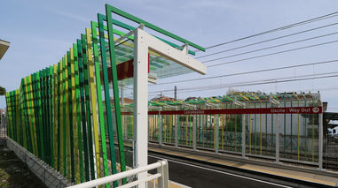 Pensiline stazioni TRC Rimini, Riccione strutture portanti. Rivestimenti alluminio , rivestimenti vetro e panchine wpc